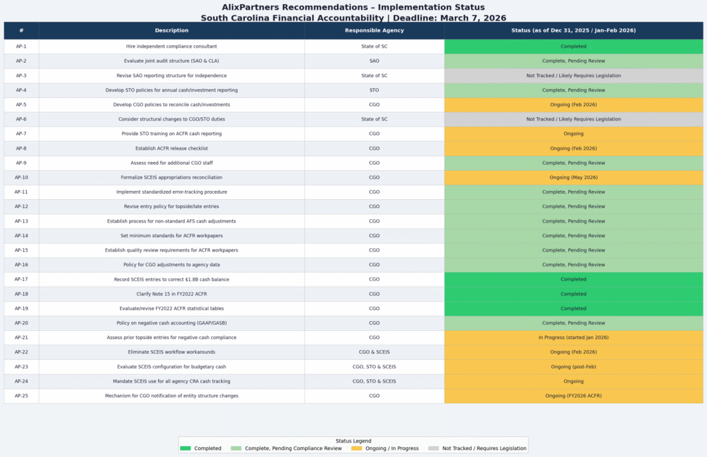 The AlixPartners Forensic Accounting Review Final Report (January 15, 2025) outlined 25 recommendations to address systemic issues in South Carolina’s financial reporting processes, particularly those contributing to the $3.53 billion cumulative overstatement in General Fund cash and equity from FY2012–2021 due to a double accounting error and an appropriations mapping error in the Annual Comprehensive Financial Report (ACFR). These stemmed from issues in the Comptroller General’s Office (CGO), State Treasurer’s Office (STO), and State Auditor’s Office (SAO), including improper topside entries, lack of reconciliations, and inadequate documentation.